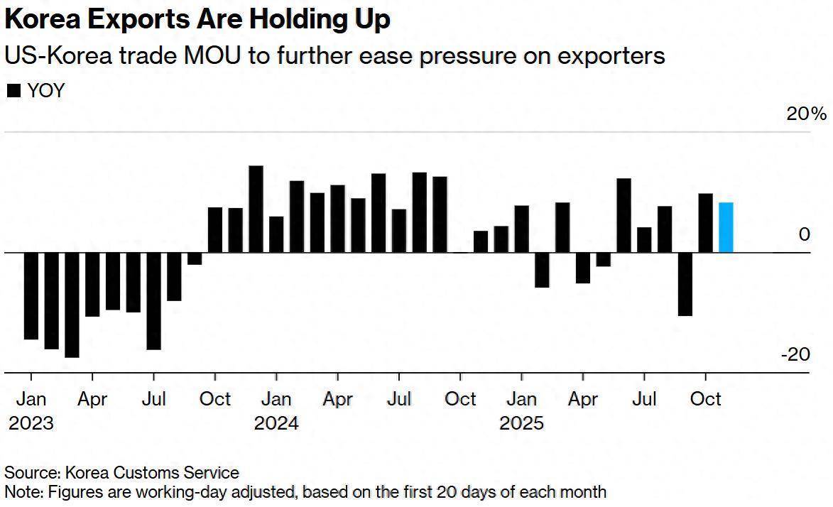 韩国海关周五公布的数据流露,经责任日各别调遣后,11月前20天的出口额同比增长8.2%。这一增幅低于10月份全月14%的增幅。