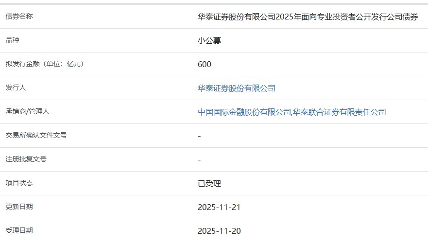 【大河财立方音问】11月21日,华泰证券股份有限公司2025年面向专科投资者公配置行公司债券获上交所受理。该债券拟刊行金额600亿元,品种为小公募天元证券_多端协同交易架构与账户安全策略解析,承销商/惩办东说念主为中金公司、华泰迷惑证券。
