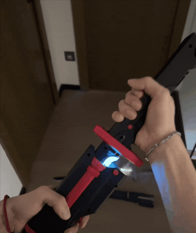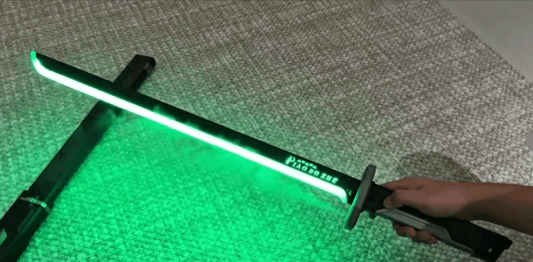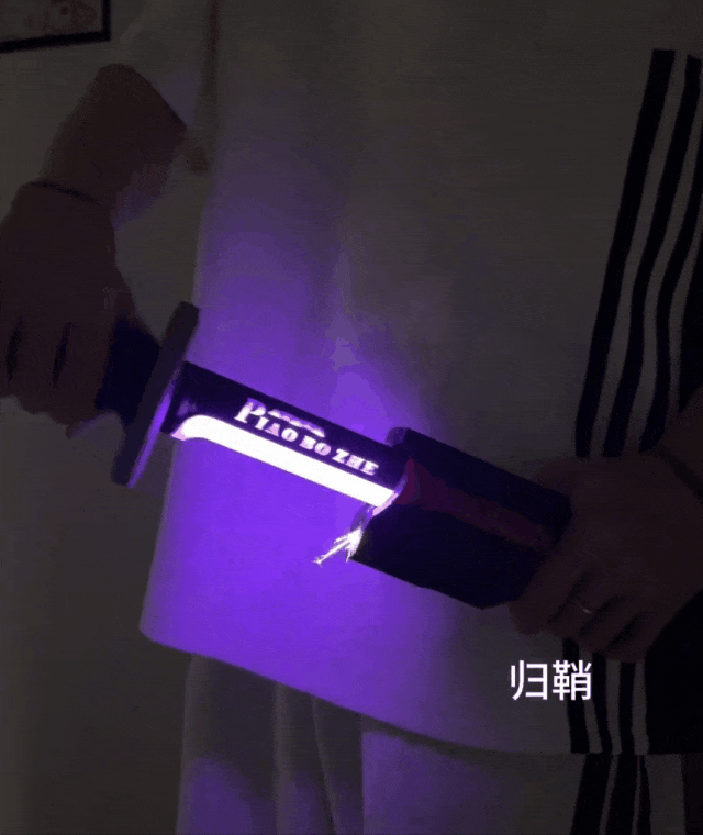 按住剑鞘上的按钮,内部就会出火花,旨趣就在内部,内部有个沙盘在摩擦打火石,是以这咧咧冒火花(这火石是销耗品来的),再合营喷雾安装+音效,谁看见了皆暗昧。除了以上经典的冒火花和喷雾,还带七彩流光,而况灯光是不错切换的,一共8种形式灯光,挥动这把剑还会发出金属碰撞声。
